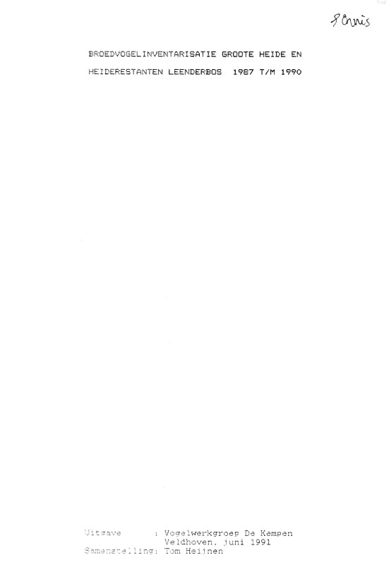 T. Heijnen. (1991, January). Broedvogelinventarisatie Groote Heide en heiderestanten Leenderbos 1987 t/m 1990. Rapporten Vogelwerkgroep De Kempen. |