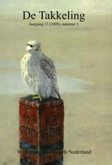 The only pair of White-tailed Eagles in The Netherlands nested again in the Oostvaardersplassen. Half a metre of nesting material was added on top of the 2008- structure, but the diameter largely remained the same. The nest is built in a Salix sp., and stands at a height of 8.7 m above ground level (in a flooded part of the marsh). On 14 May 2009, when the nest was visited for ringing purposes and the collection of prey remains, an unhatched egg was found together with a single chick. Based on back-calculation from the estimated age of the chick (using measurements taken during ringing, when the male chick was c. 38 days old), laying was estimated to have commenced on 28 February. Compared to 2006, the year that the pair settled and attempted breeding for the first time, egg laying has shifted forwards for almost a month (26 March vs. 28 February). This is in line with the increasing age of the breeding pair (female in 2009 in her 7th calender-year, the male even older but of unknown age). Prey remains found on the nest involved Coot Fulica atra (11), Greylag Geese Anser anser (2) and Carp Cyprinus carpio (2). A similar diet was found in previous years, and reflects prey species in high abundance in the Oostvaardersplassen. The fruits of colour-ringing (which started in 2007; in 2006 the chick was not ringed) were finally reaped in 2009 when four observations became available, scattered from 25, 85 and 125 km (within The Netherlands, twice involving the female chick ringed in 2007 and once one of the 2008-chicks) to 380 km (Schleswig-Holstein, Scharsee, the male ringed as a chick in 2008). The latter site is an important area for immature, non-breeding White-tailed Eagles.
