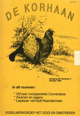 Bij het uitkomen van deze Korhaan is de zomer van 1994 al weer voorbij. Voor de werkgroep is deze periode doorgaans een wat rustiger periode. De nestbeschermingsactiviteiten en de inventarisaties zijn achter de rug en hoewel veel van onze leden in de vakantieperiode ongetwijfeld interessante gebieden met een goede kans op leuke waarnemingen zullen hebben bezocht, zijn er eigenlijk geen gerichte veldonderzoeken meer aan de gang. In de periode voor ons ligt echter weer een drukke tijd, waarin er volop gelegenheid is om u bezig te gaan houden met het beschermen of bestuderen van vogels. Wie wat meer wil weten van de vogeltrek, kan ook dit seizoen op de woensdag- en zaterdagochtenden weer terecht bij de trektelpost in het Corversbos. Ik kan u echt aanraden daar een keer te gaan kijken of, beter nog, af en toe mee te gaan werken aan het vogeltrekonderzoek, want dat is beslist heel leerzaam. Verder zullen er in de komende herfst- en winterperiode natuurlijk ook weer diverse jaarlijkse tellingen worden gehouden. Voorbeelden zijn de ganzentellingen, steltlopertellingen en de watervogeltellingen langs de randen van het Gooimeer. Voor de meeste tellingen is er een vaste kern van tellers, maar daarbij kan altijd wel hulp gebruikt worden. Ook dit werk is heel leerzaam, vooral voor ‘beginnende’ vogelaars.